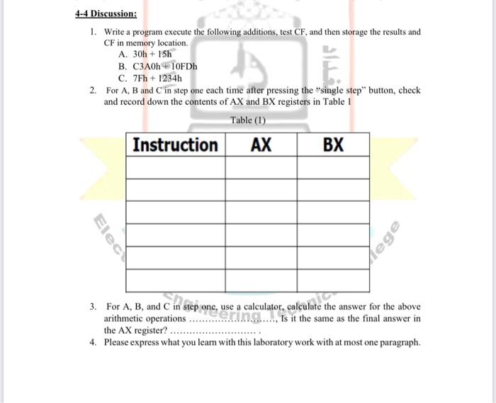 Examples Inputs and output are given in Hexadecimal representation. Add the content of A and B register. Example Algorithm Load data from offset 500 to register AL first number.